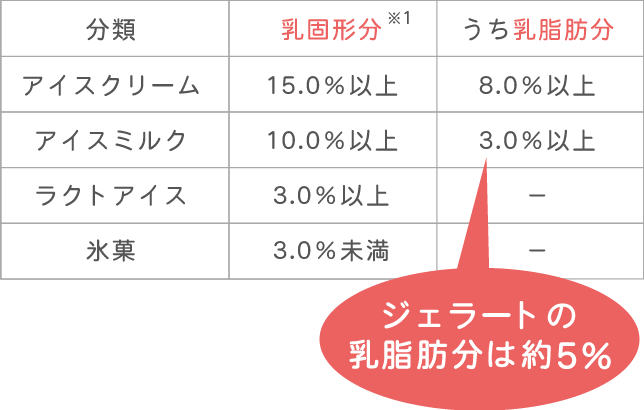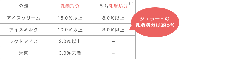 一方日本では、アイス類は下記の表のように乳固形分(牛乳から水分を引いたもの)などの含有率によって分類されます。