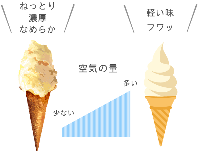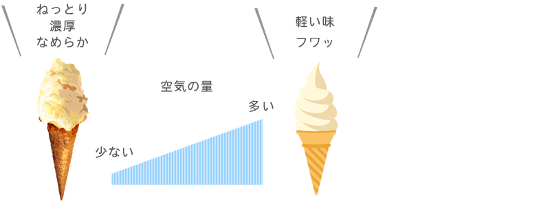 その秘密は、「空気の量」。フワッとした軽い仕上がりのソフトクリームが40~60%なのに対して、ジェラートは30%前後と少なく、このことが、「密度の濃い、なめらか」な口当たりにつながっています。空気の量が少ないとねっとりした重みのある味になり、空気の量が多いとフワッと軽い味になります。